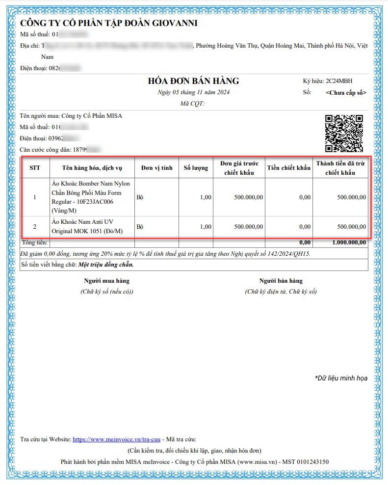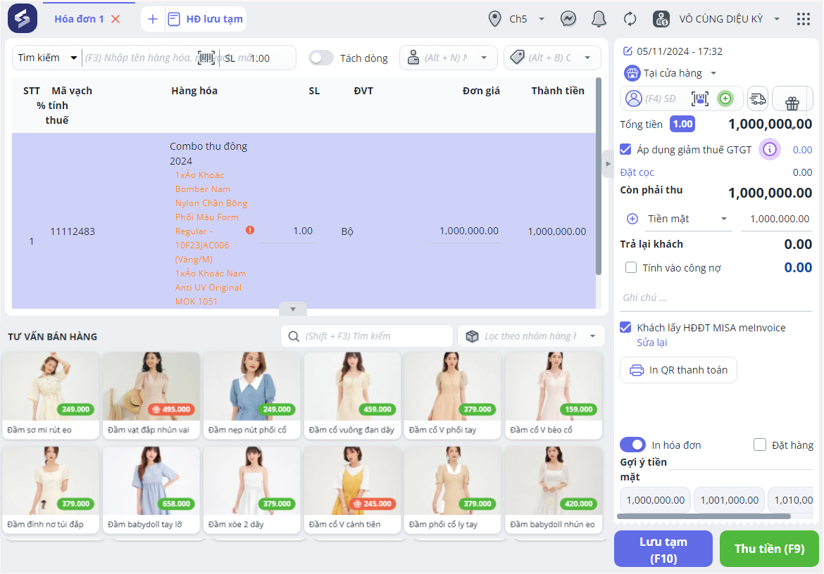 3.2. Trên phần mềm bán hàng SC, khi xuất hóa đơn cho hàng hóa combo, hệ thống sẽ truyền thông tin chi tiết các hàng hóa thành phần của combo đó sang meInvoice để hiển thị trên hóa đơn