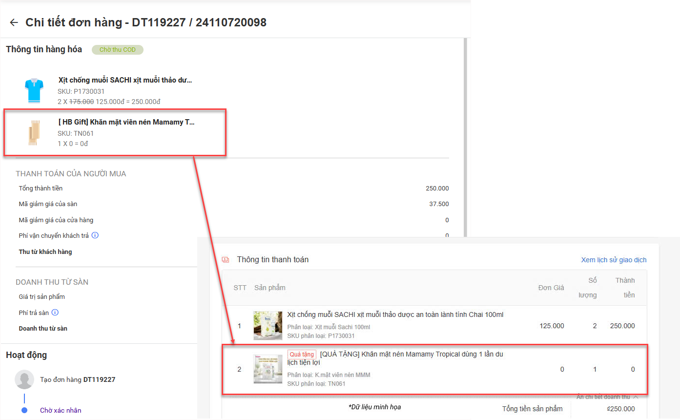 Trên phần mềm OCM, khi hệ thống đồng bộ đơn hàng từ sàn về, các sản phẩm được gắn tag Quà tặng sẽ tự động hiển thị với đơn giá = 0.