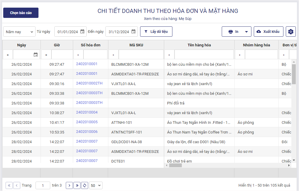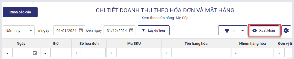 – Chọn loại báo cáo Chi tiết doanh thu theo hóa đơn và mặt hàng (Hoặc Doanh thu theo mặt hàng/Chi tiết doanh thu mặt hàng theo hóa đơn)