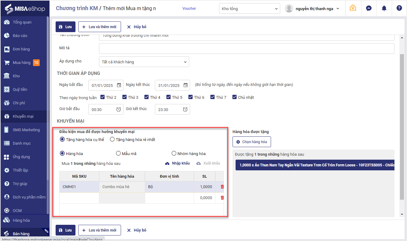 – Khi tạo chương trình khuyến mại Mua m tặng n, tại mục Điều kiện mua để hưởng khuyến mại, chọn điều kiện Tặng hàng hóa cụ thể, chọn Mã SKU và chọn Hàng hóa được tặng, hệ thống sẽ hiển thị cả các hàng hóa thuộc loại Combo trong danh sách chọn hàng mua