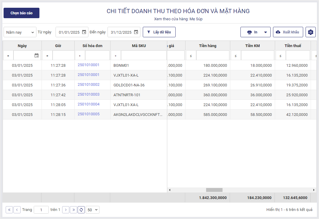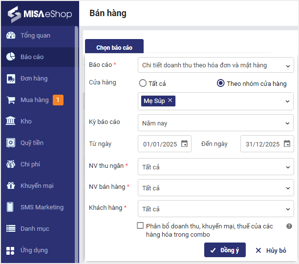Chọn loại báo cáo Chi tiết báo doanh thu theo hóa đơn và mặt hàng