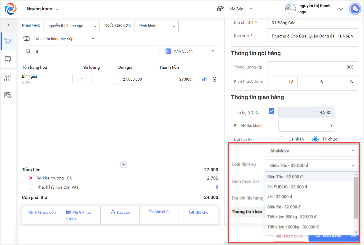Trên phần mềm bán hàng OCM, khi nhân viên tạo đơn giao hàng và chọn đối tác giao nhận Ahamove, hệ thống sẽ tự động hiển thị tất cả các gói dịch vụ theo tài khoản Ahamove của khách hàng