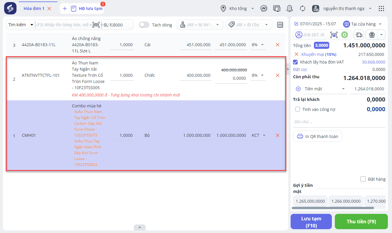 – Tại màn hình hóa đơn bán hàng, nếu số lượng Combo đáp ứng đủ điều kiện của CTKM Mua m tặng n, hệ thống sẽ cho phép nhân viên chọn hàng tặng tương ứng