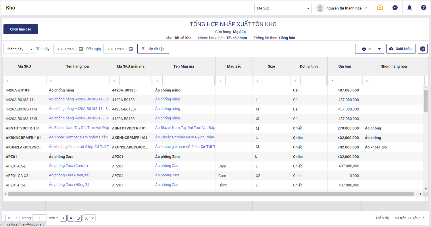 Trên trang quản lý, vào Báo cáo/Kho và chọn loại báo cáo Tổng hợp nhập xuất tồn