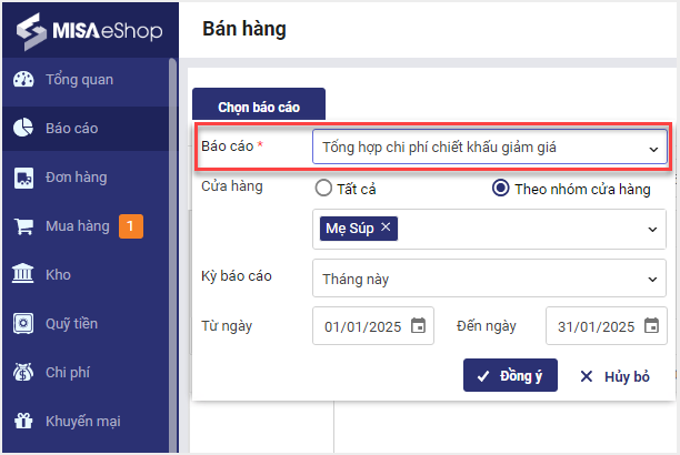 – Chọn Tổng hợp chi phí chiết khấu giảm giá