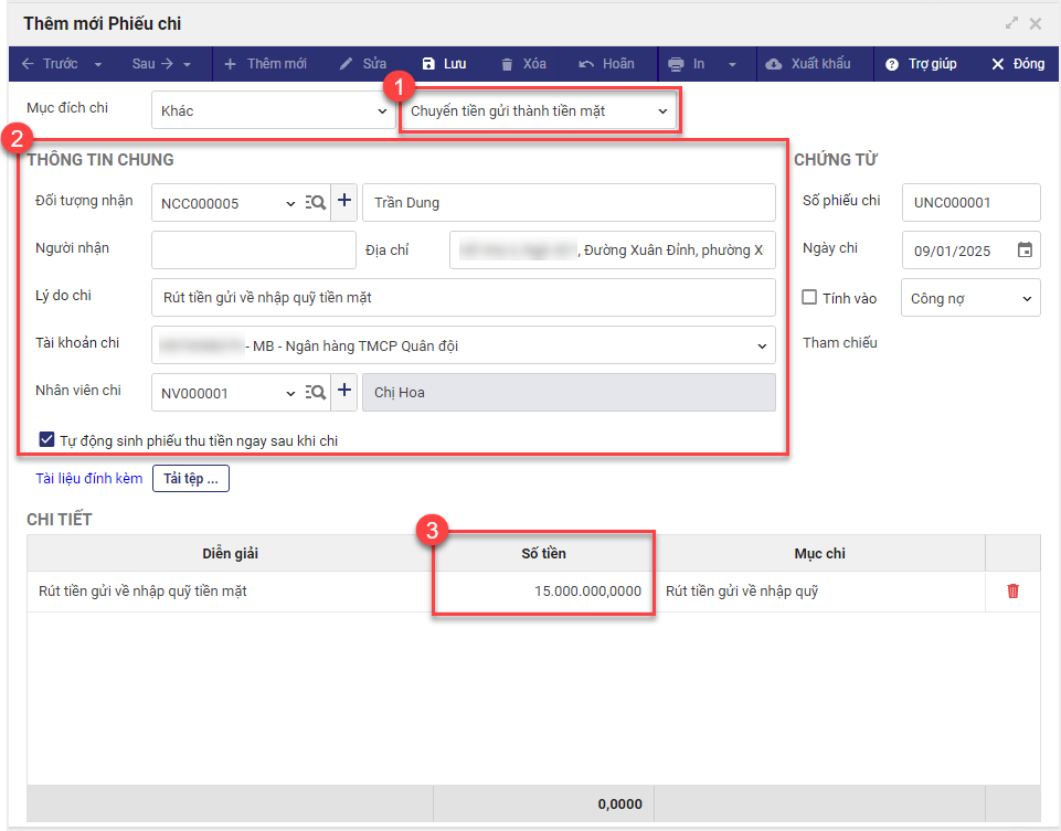 – Nhập các thông tin cần thiết. Chọn phương thức thu tiền tại cửa hàng nhận (Tiền mặt hoặc Tiền gửi) kế bên dòng Tự động sinh phiếu thu tiền ngay sau khi chi