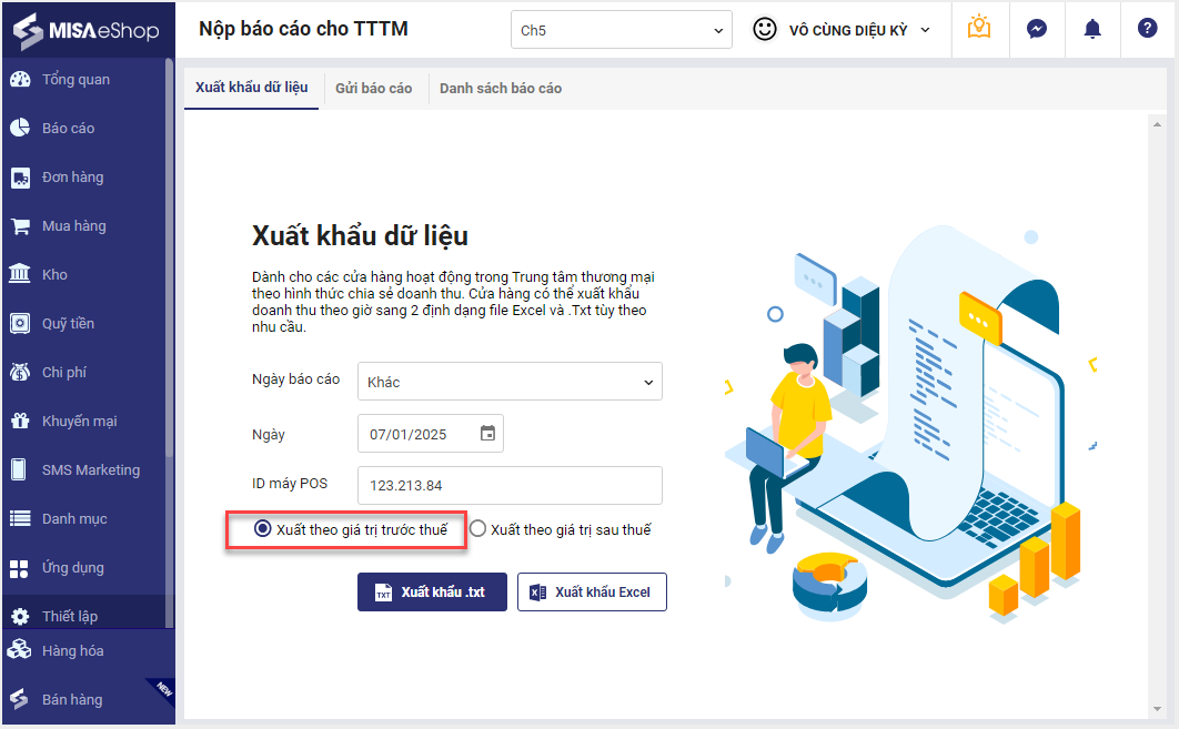 Giúp Cửa hàng xuất khẩu số liệu doanh thu trước thuế, đáp ứng đúng yêu cầu và quy định báo cáo tài chính của Trung tâm thương mại