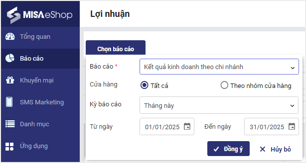 Sau đó, chọn kỳ báo cáo, thời gian muốn xem báo cáo (Từ ngày…đến ngày) và nhấn Đồng ý