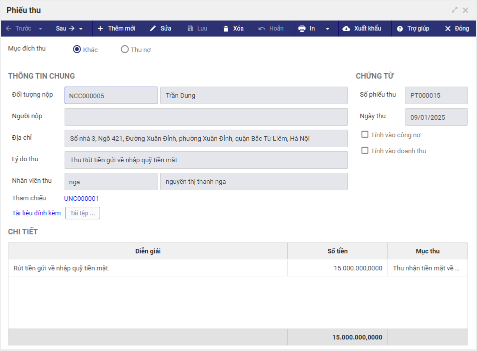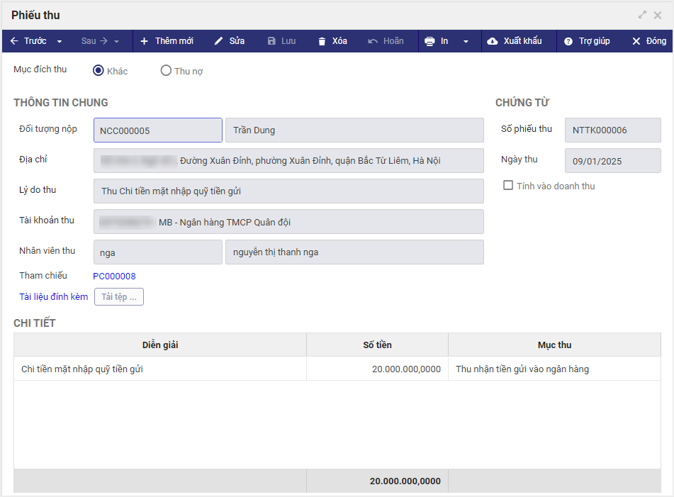 Sau khi nhấn Lưu, hệ thống sẽ tự động sinh một phiếu thu tiền mặt tương ứng. Dữ liệu được hiển thị chi tiết như ảnh dưới đây