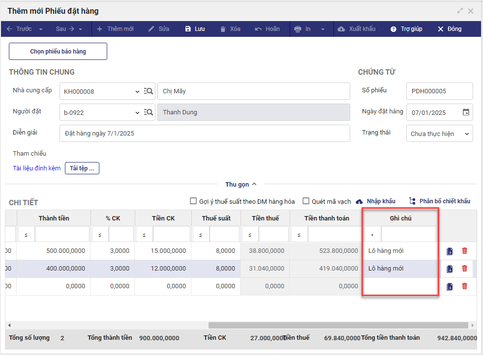 4. QLCH có thể nhập được ghi chú cho từng dòng hàng hóa trong các phiếu nhập xuất kho, mua hàng