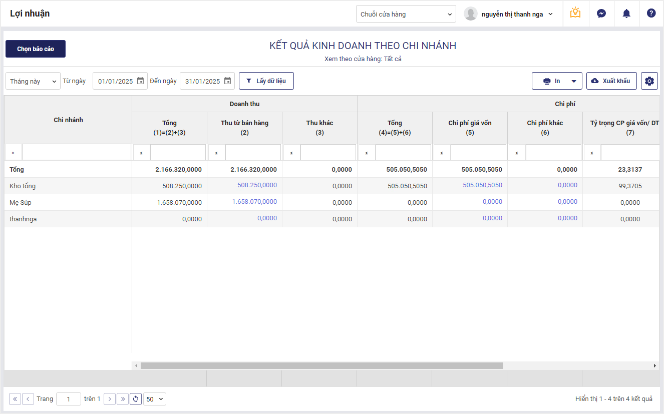 – Chọn Báo cáo kết quả kinh doanh theo chi nhánh