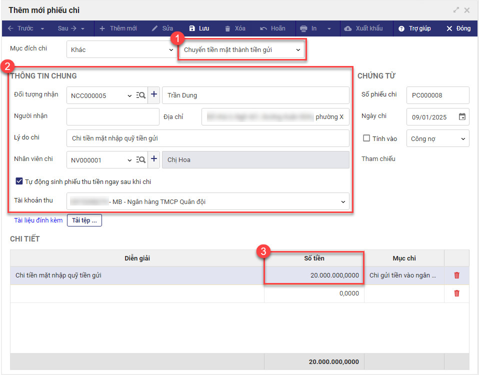 – Tại giao diện Thêm mới phiếu chi, chọn Chuyển tiền mặt thành tiền gửi