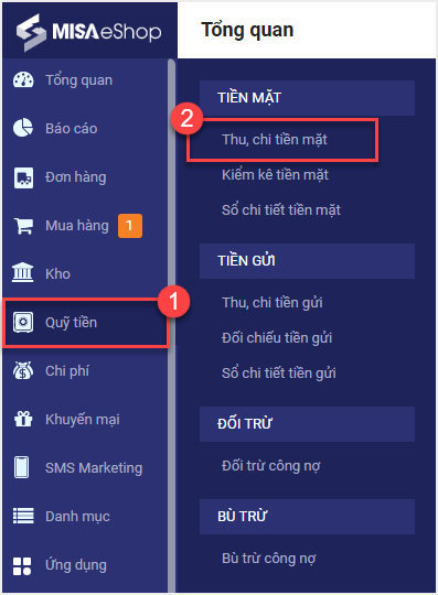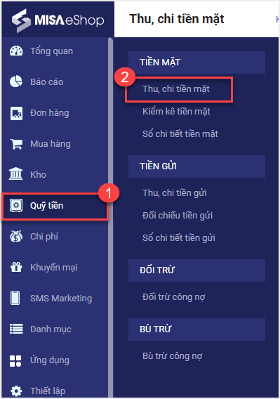 Trên trang quản lý, vào Quỹ tiền/Thu, chi tiền mặt