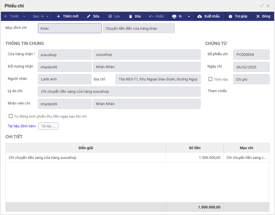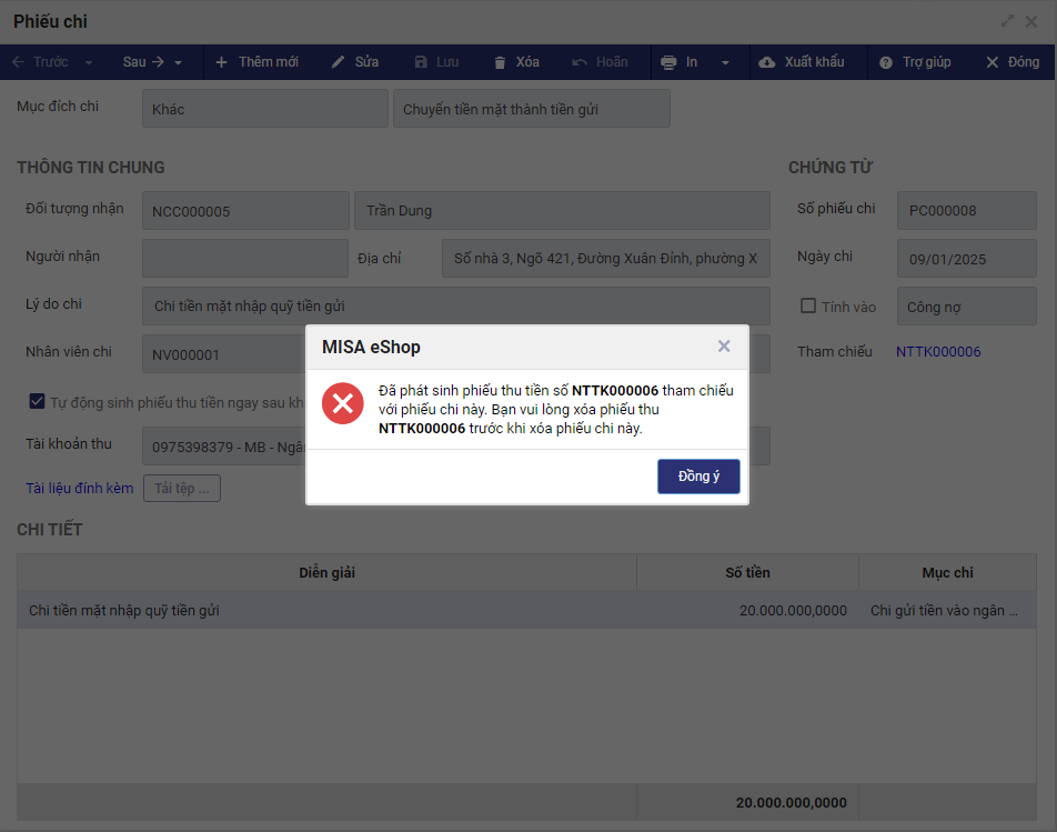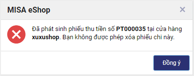 ❌ Không thể xóa phiếu chi chuyển tiền đến cửa hàng khác nếu đã phát sinh phiếu thu tại cửa hàng nhận. Khi nhấn xóa, hệ thống sẽ hiển thị cảnh báo Đã phát sinh phiếu thu số <Số PT tham chiếu> tại cửa hàng <Tên cửa hàng nhận>. Bạn không được phép xóa phiếu chi này