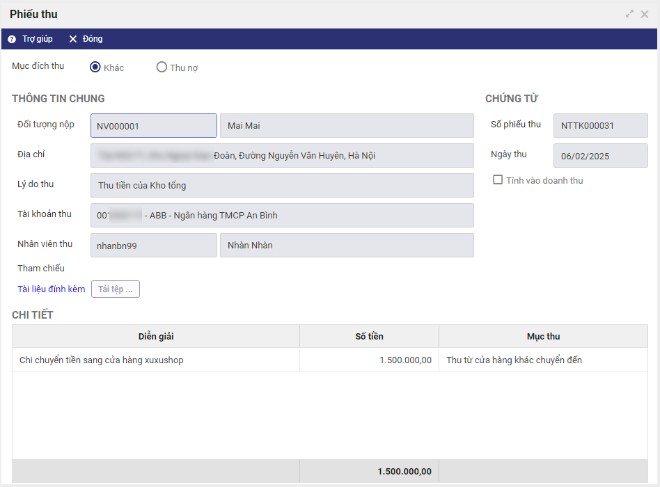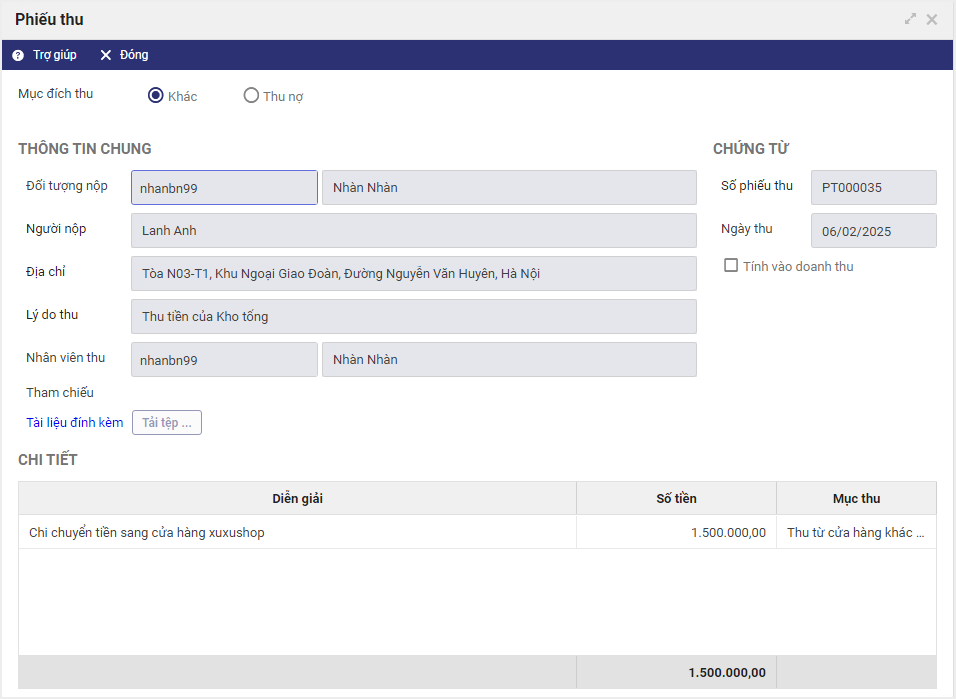 Lúc này, hệ thống sẽ tự động tạo 1 phiếu thu tiền (Tiền mặt hoặc Tiền gửi) tương ứng tại Cửa hàng nhận