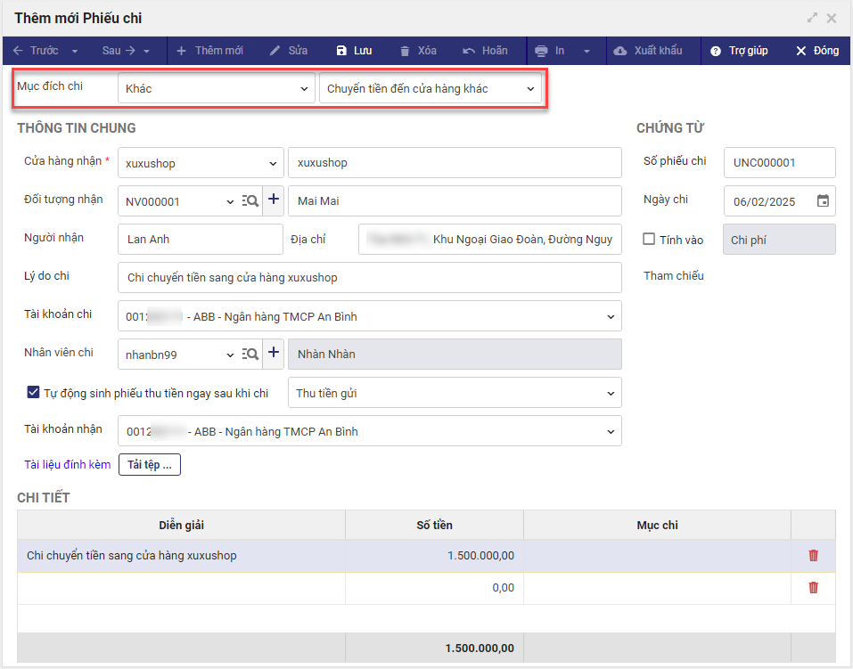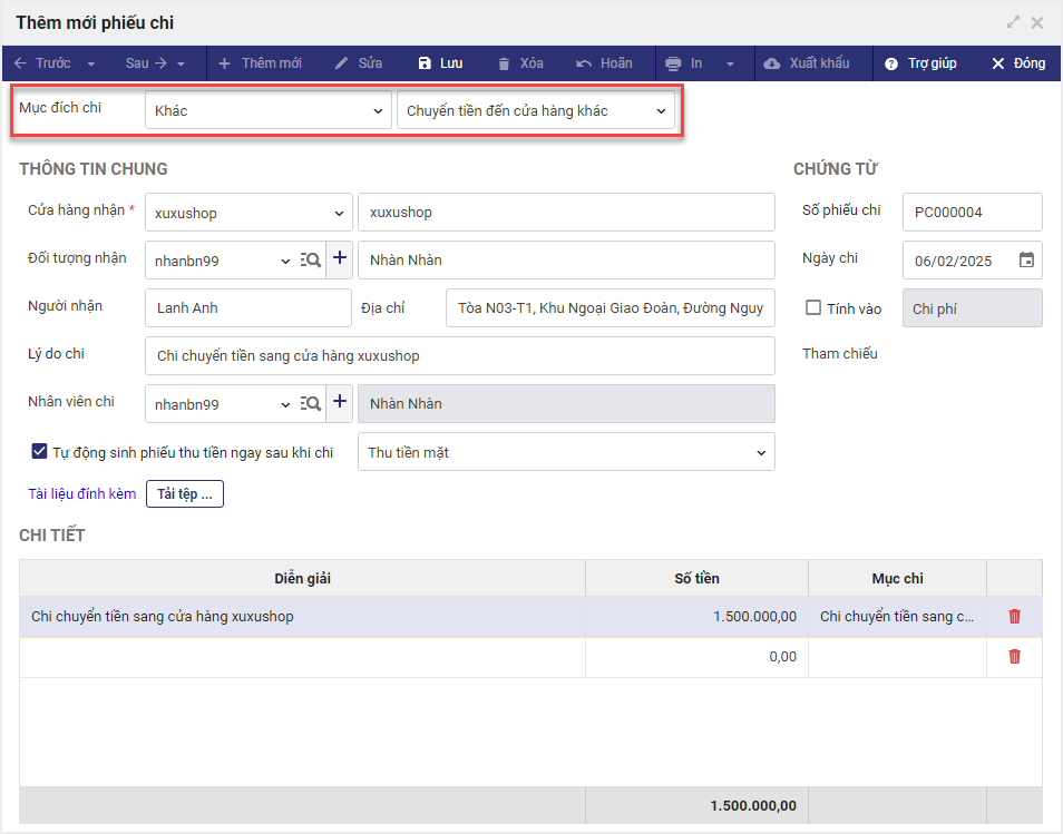 ✅ Có thể xóa phiếu thu ở cửa hàng nhận, hệ thống sẽ: Xóa dữ liệu tham chiếu trong phiếu chi chuyển tiền và bỏ chọn Tự động sinh phiếu thu tiền ngay sau khi chi trên phiếu chi đó