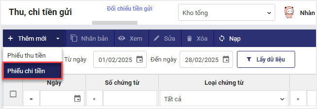 Trên trang quản lý, vào Quỹ tiền/Thu, chi tiền gửi
