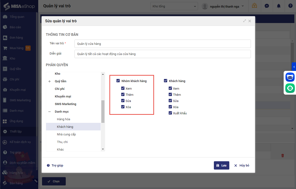 Kể từ phiên bản R92, MISA eShop bổ sung thêm quyền Thêm Danh mục Nhóm khách hàng cho các vai trò được phân quyền trên trang bán hàng SC