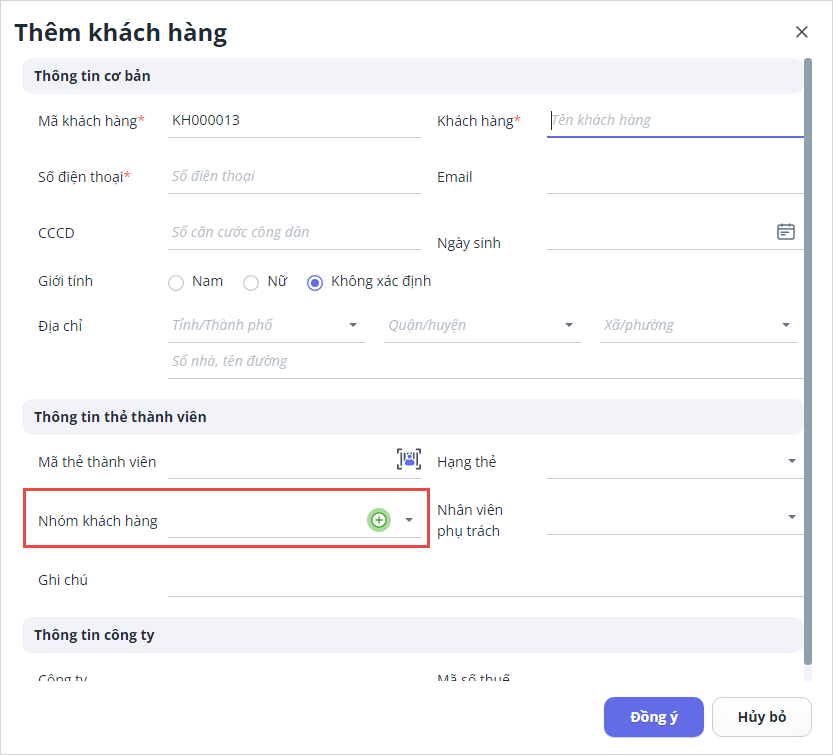 Người dùng chỉ cần đăng nhập bằng tài khoản có quyền thêm nhóm khách hàng. Khi thêm khách hàng mới, hệ thống sẽ mặc định hiển thị thêm trường thông tin Nhóm khách hàng để người dùng lựa chọn hoặc thêm mới