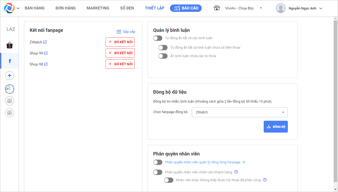Chi tiết thay đổi: Hiện nay, OCM chỉ hiển thị một Fanpage mà cửa hàng kết nối. Trường hợp cửa hàng kết nối nhiều Fanpage thì danh sách sẽ bị ẩn đi. Giúp quản lý dễ dàng theo dõi các Fanpage mà cửa hàng đã kết nối, từ phiên bản RC10, chương trình thay đổi cách hiển thị danh sách Fanpage.