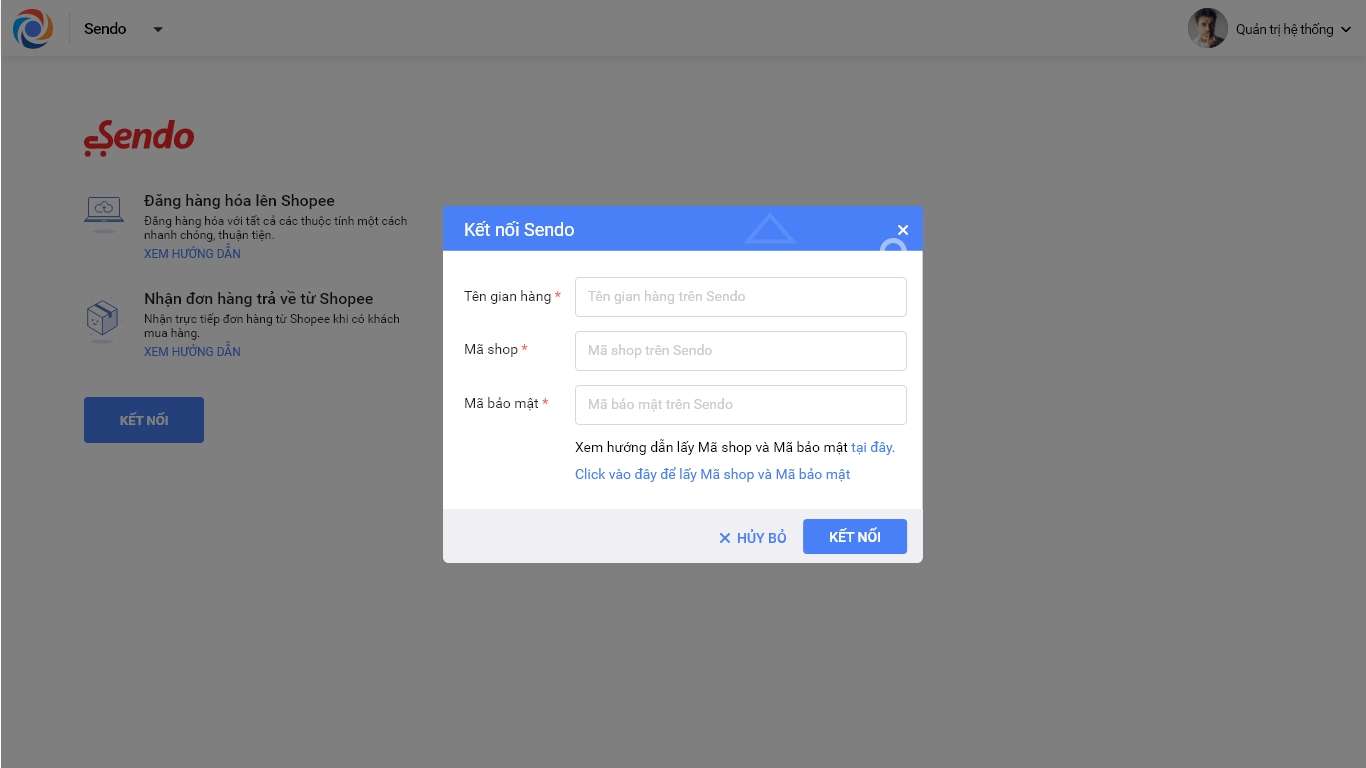 Khi nhấn Kết nối với Sendo, người dùng cần nhập Tên gian hàng, Mã shop và Mã bảo mật của gian hàng.