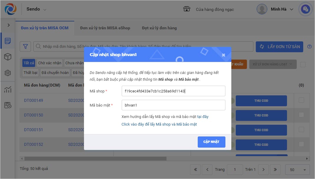 Lưu ý: “Mã shop” và “Mã bảo mật” là chuỗi ký tự do Sendo cung cấp, cho phép cửa hàng sử dụng để kết nối OCM với sàn Sendo.
