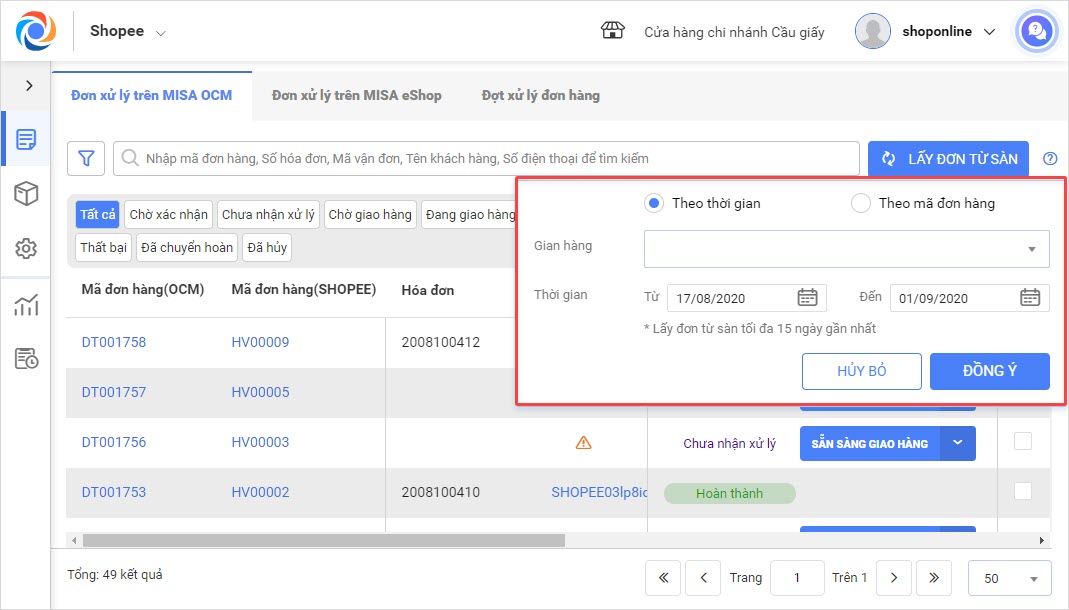 Kể từ phiên bản RC29, chương trình bổ sung tính năng giúp cửa hàng có thể lấy các đơn hàng bị thiếu từ sàn về OCM trong khoảng thời gian cụ thể (tối đa 15 ngày gần nhất). Ngoài việc nhập chính xác mã đơn hàng, cửa hàng có thể chọn từ ngày … đến ngày … để lấy đơn từ sàn về phần mềm.