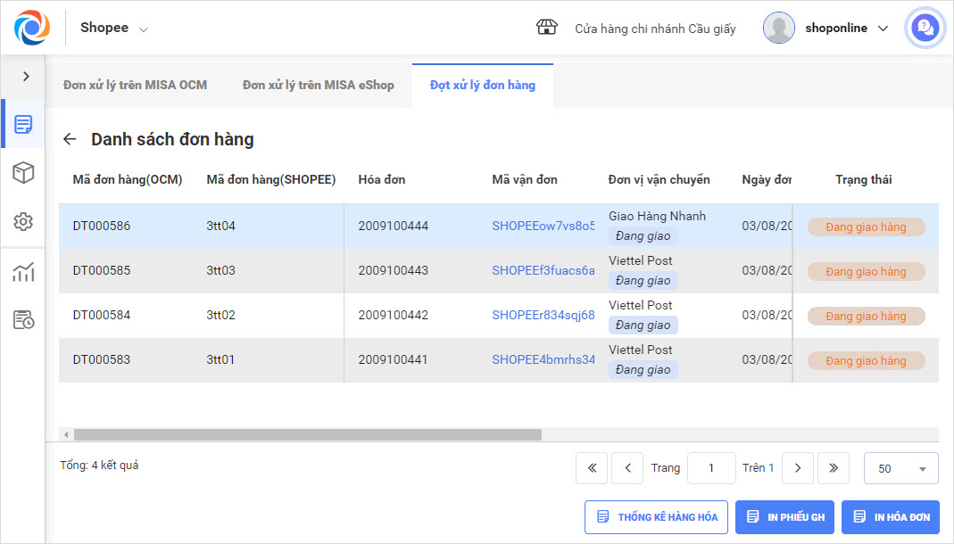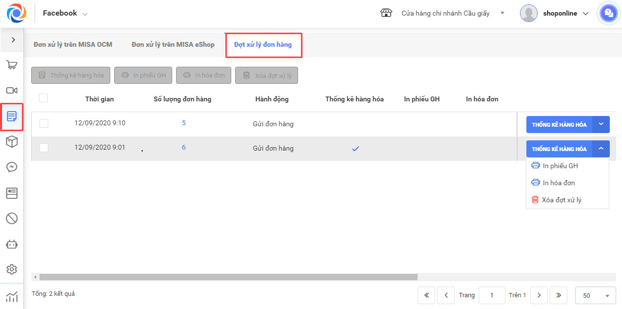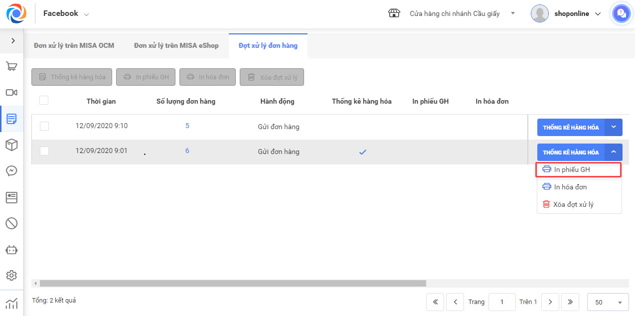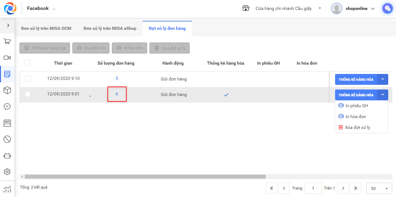 - Để xử lý từng đợt, người dùng nhấn vào nút chức năng bên phải đợt xử lý và lựa chọn Thống kê hàng hóa/ In phiếu GH/ In hóa đơn/ Xóa đợt xử lý.