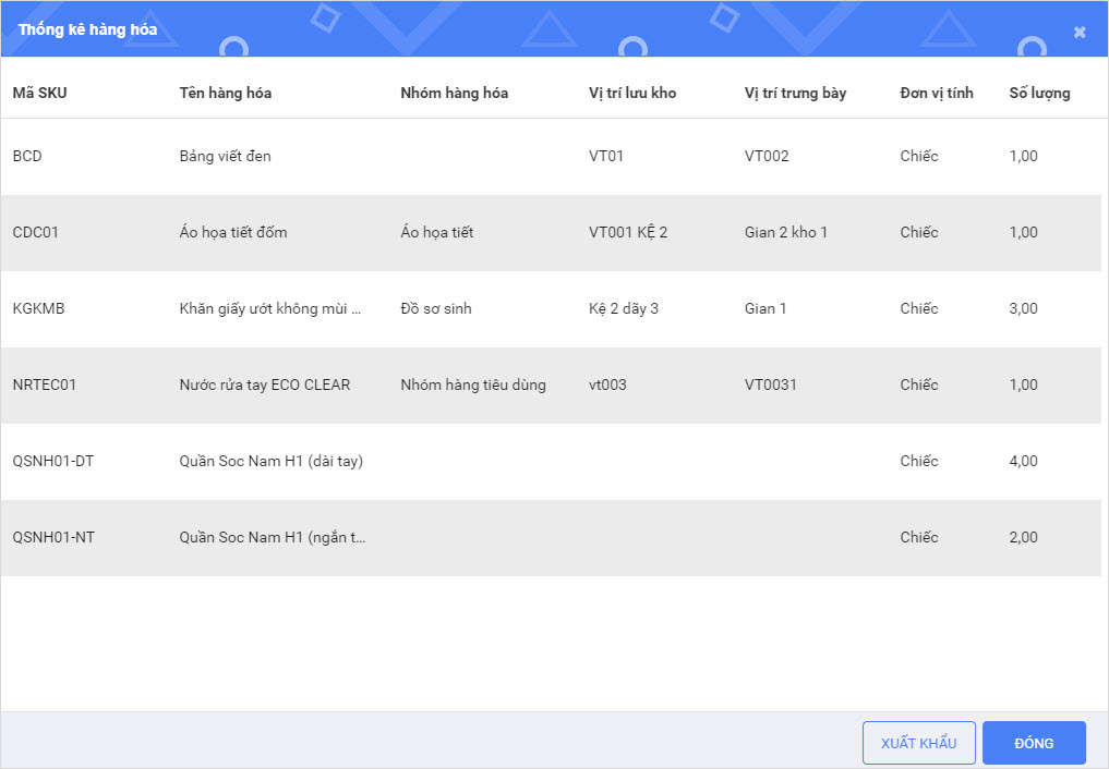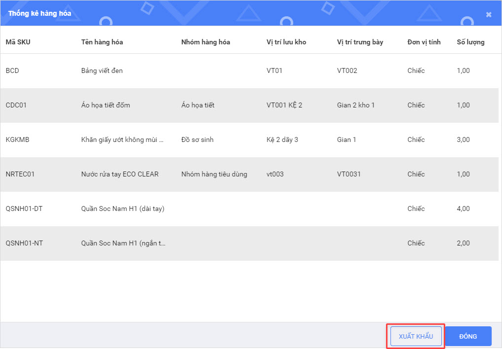 Người dùng có thể Xuất khẩu danh sách thống kê hàng hóa ra file Excel bằng cách nhấn Xuất khẩu.