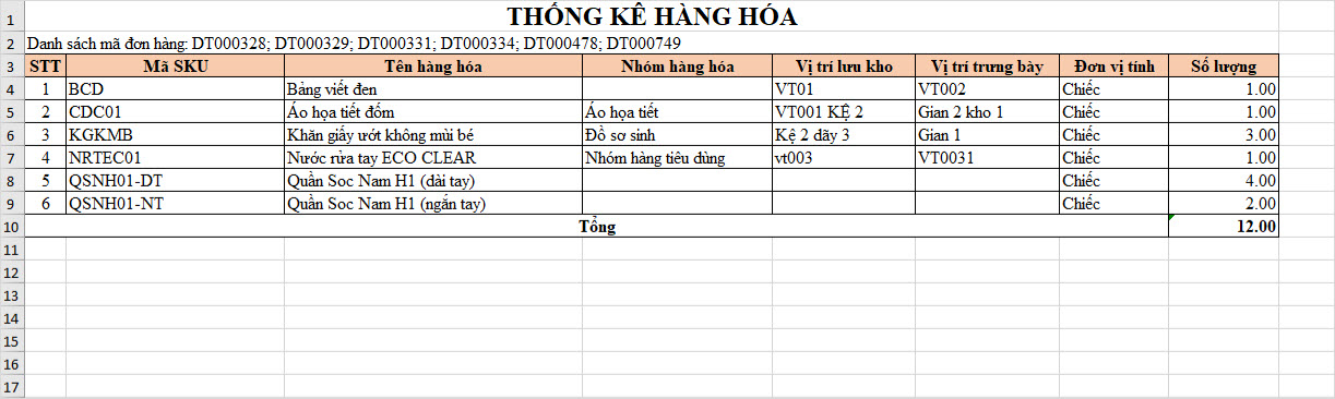 Mục đích: Cửa hàng bán hàng online qua các sàn TMĐT, để tránh việc nhân viên phải đi nhặt hàng nhiều lần, trong phiên bản RC29, chương trình bổ sung tính năng Thống kê hàng hóa giúp cửa hàng thống kê được số lượng hàng hóa cần đóng gói, vị trí trong kho của các hàng hóa đó. Nhân viên chỉ cần đến đúng các vị trí chứa hàng hóa đó trong kho và lấy theo số lượng trên phiếu thống kê. Sau đó, thực hiện đóng gói theo mã đơn hàng và gửi cho đơn vị vận chuyển.
