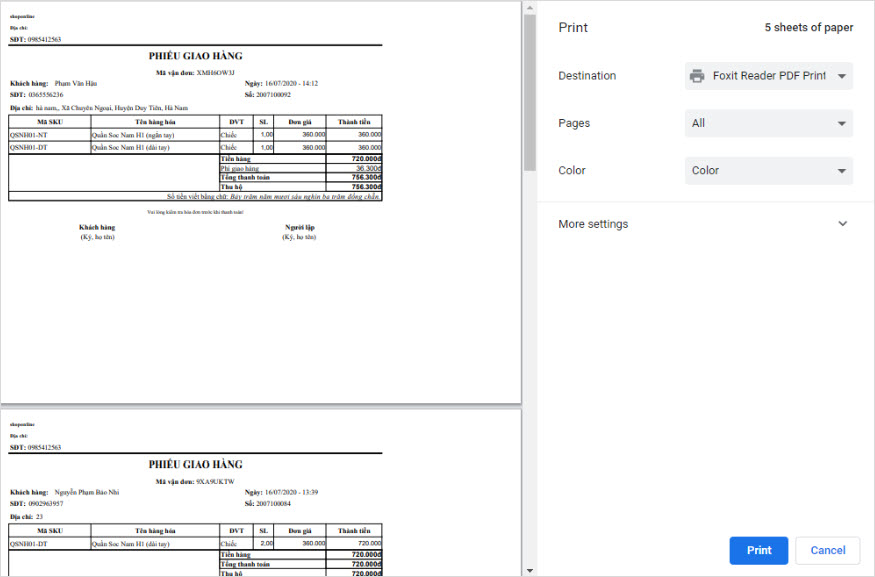- Sau khi xử lý xong, chương trình sẽ hiển thị danh sách phiếu giao hàng dưới định dạng PDF, người dùng thực hiện kiểm tra lại hóa đơn và nhấn Print để in.