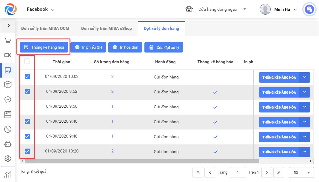 - Để xử lý nhiều đợt cùng lúc, tích chọn vào các đợt cần xử lý, nhấn nút Thống kê hàng hóa/In phiếu GH/In hóa đơn/Xóa đợt xử lý trên góc trái màn hình.
