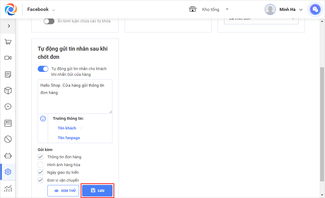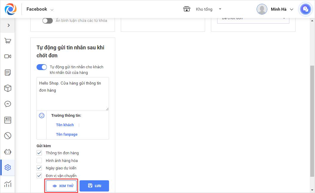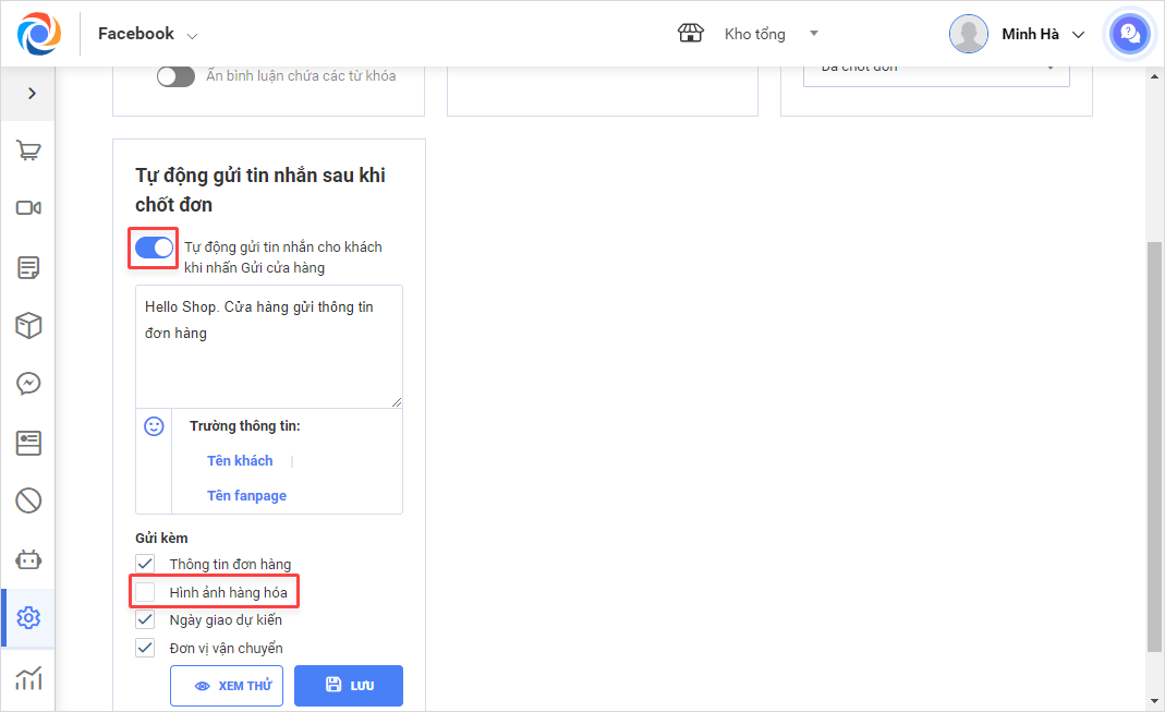 Bước 2: Bật tính năng Tự động gửi tin nhắn sau khi chốt đơn\Phần Gửi kèm, bỏ tích Hình ảnh hàng hóa để ẩn hình ảnh khi gửi thông tin đơn hàng cho khách.