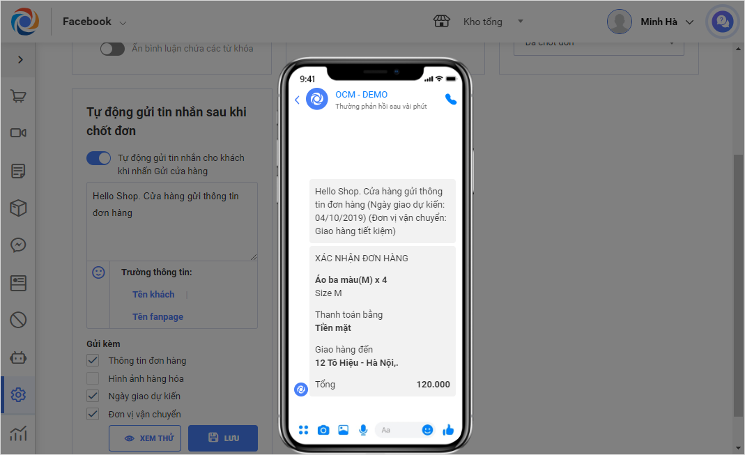 3. Cửa hàng có thể thiết lập ẩn/hiện hình ảnh hàng hóa khi gửi tin nhắn chốt đơn cho khách hàng qua facebook.
