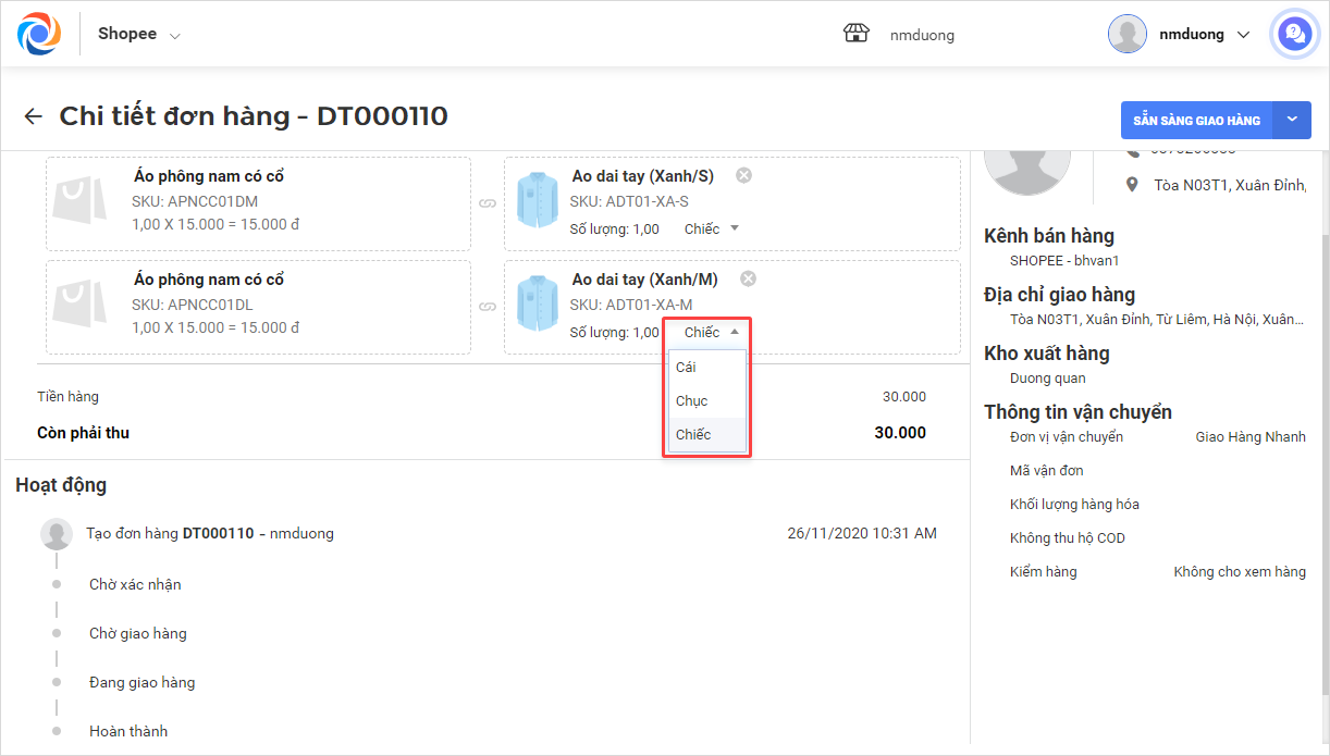 - Số lượng hàng hóa đã liên kết sẽ bằng số lượng hàng hóa trên đơn hàng.