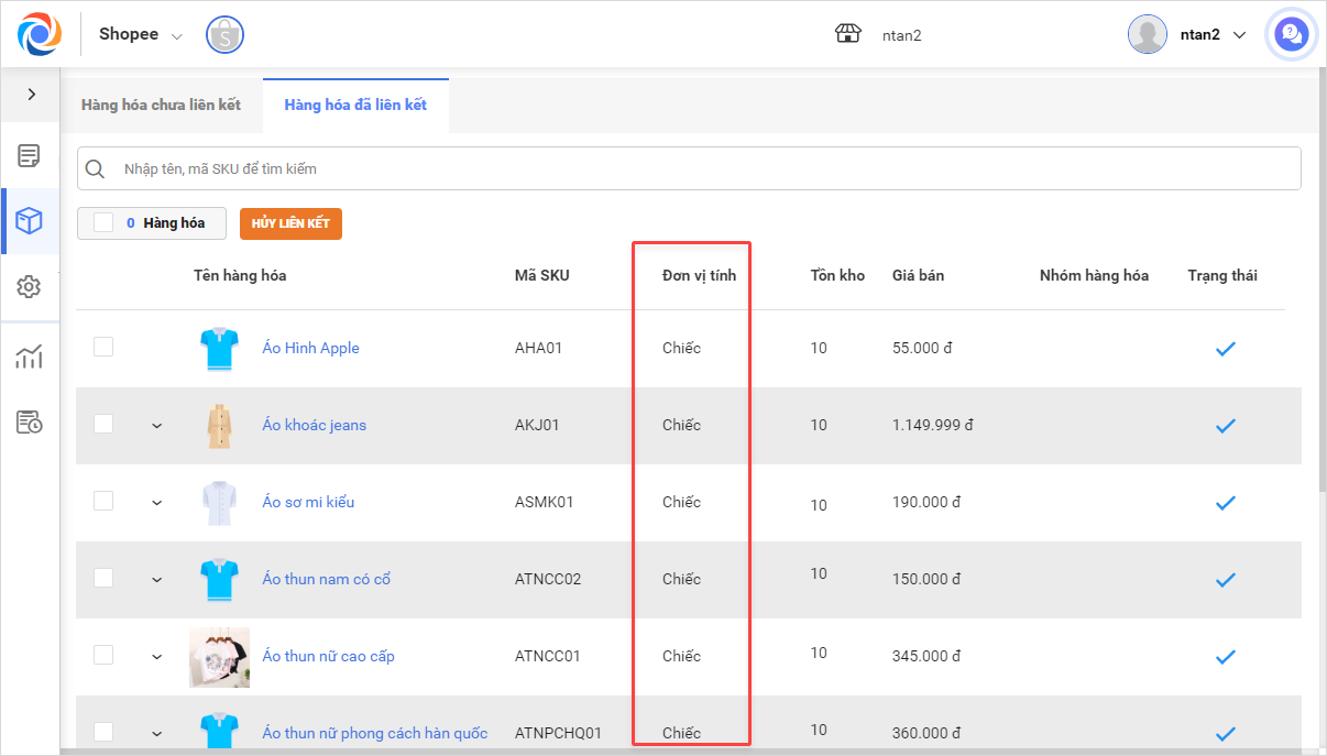 Tại tab Hàng hóa đã liên kết\Danh sách hàng hóa, đơn vị tính sẽ lấy theo đơn vị tính đồng bộ lên sàn.