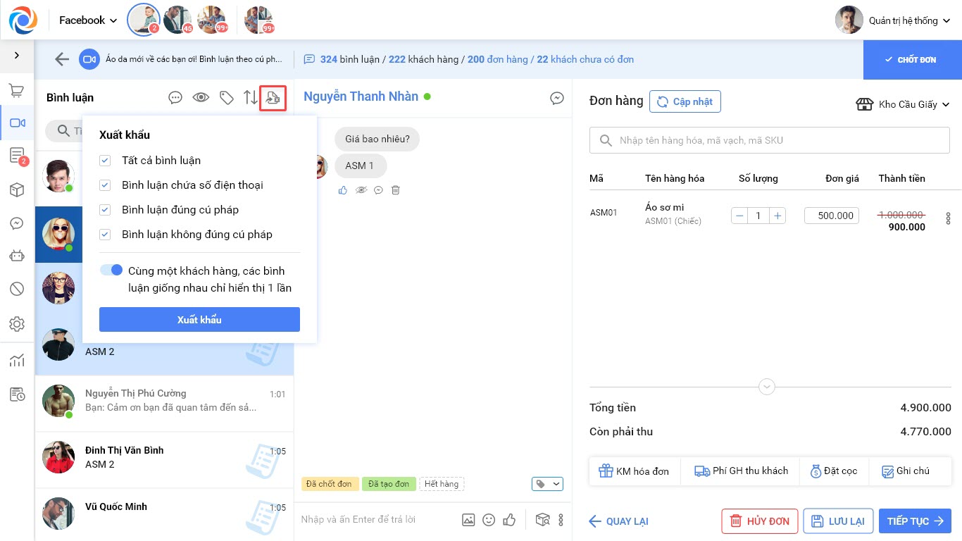 <4. QLCH/NV trực Livestream có thể xuất khẩu được danh sách bình luận có chứa số điện thoại để dễ dàng theo dõi và liên hệ mà không mất thời gian lọc thủ công.