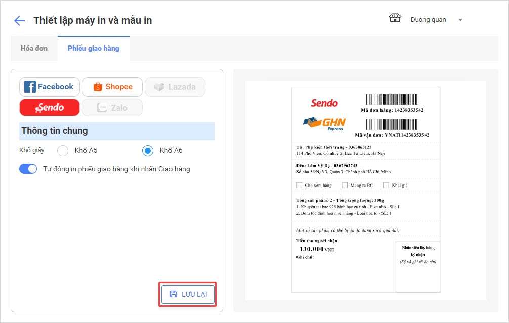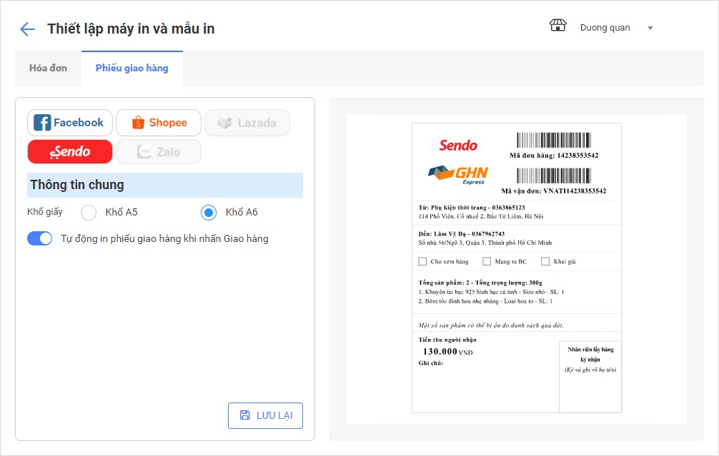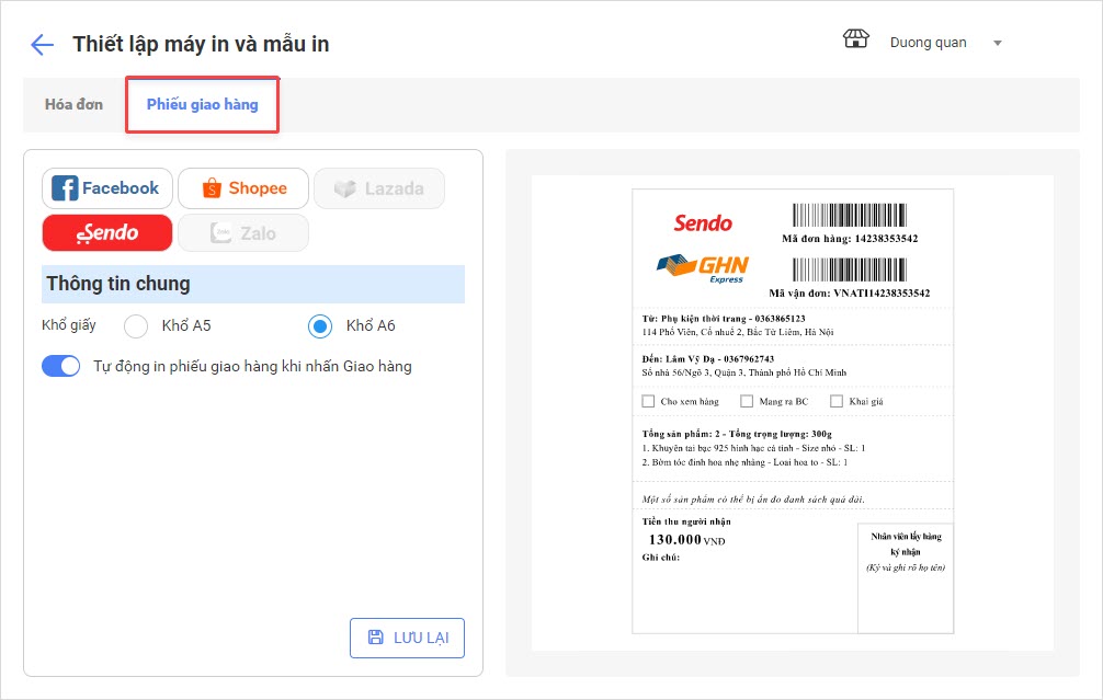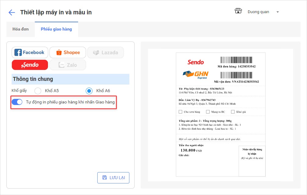 Bước 4: Cửa hàng có thể bật tính năng Tự động in phiếu giao hàng khi nhấn Giao hàng.