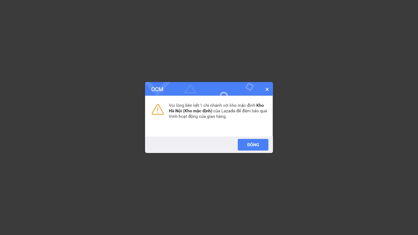 - Bắt buộc cửa hàng phải liên kết với kho mặc định để đảm bảo quá trình hoạt động của gian hàng. Trường hợp chưa liên kết sẽ hiển thị cảnh báo như ảnh dưới đây.