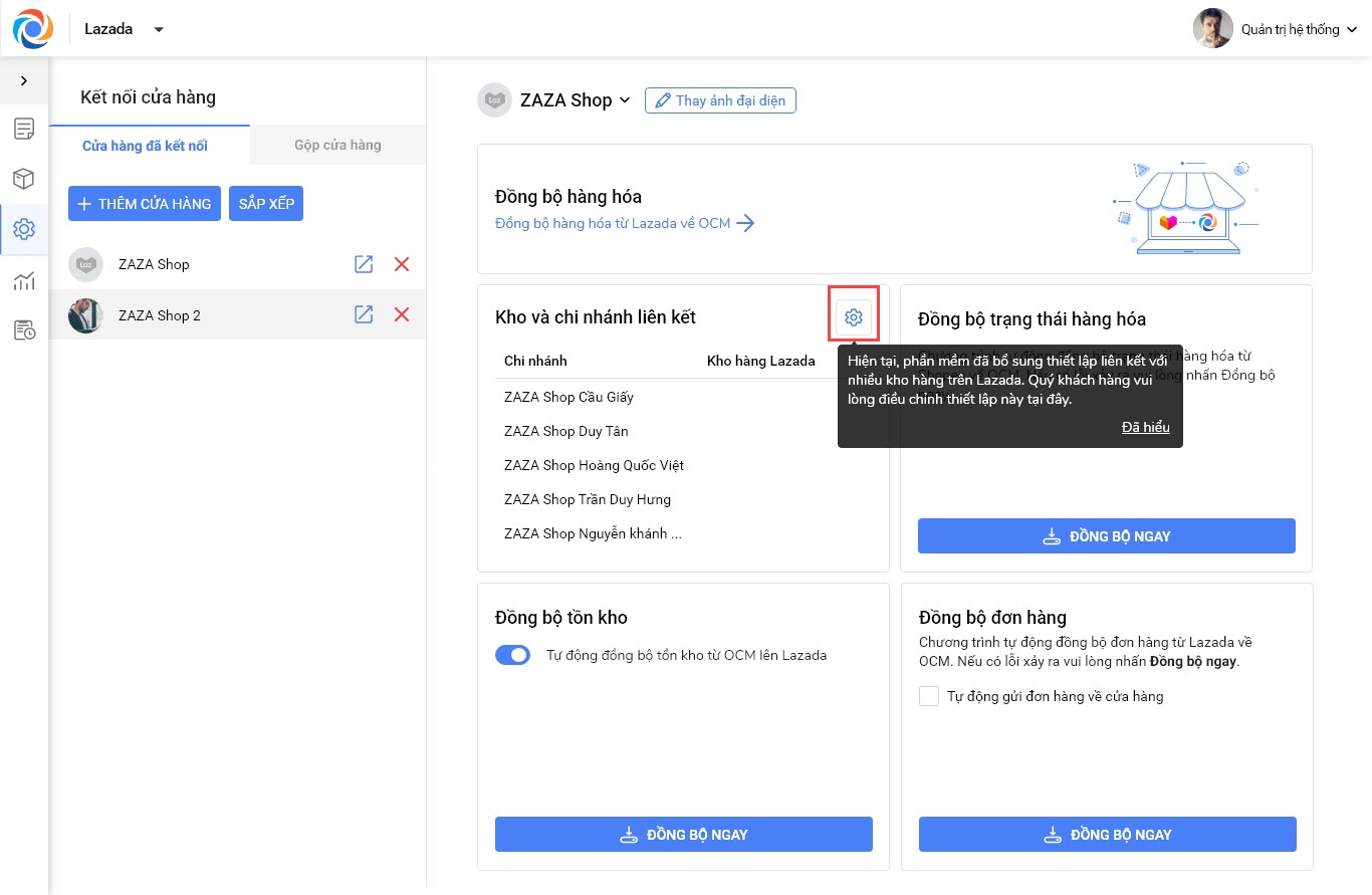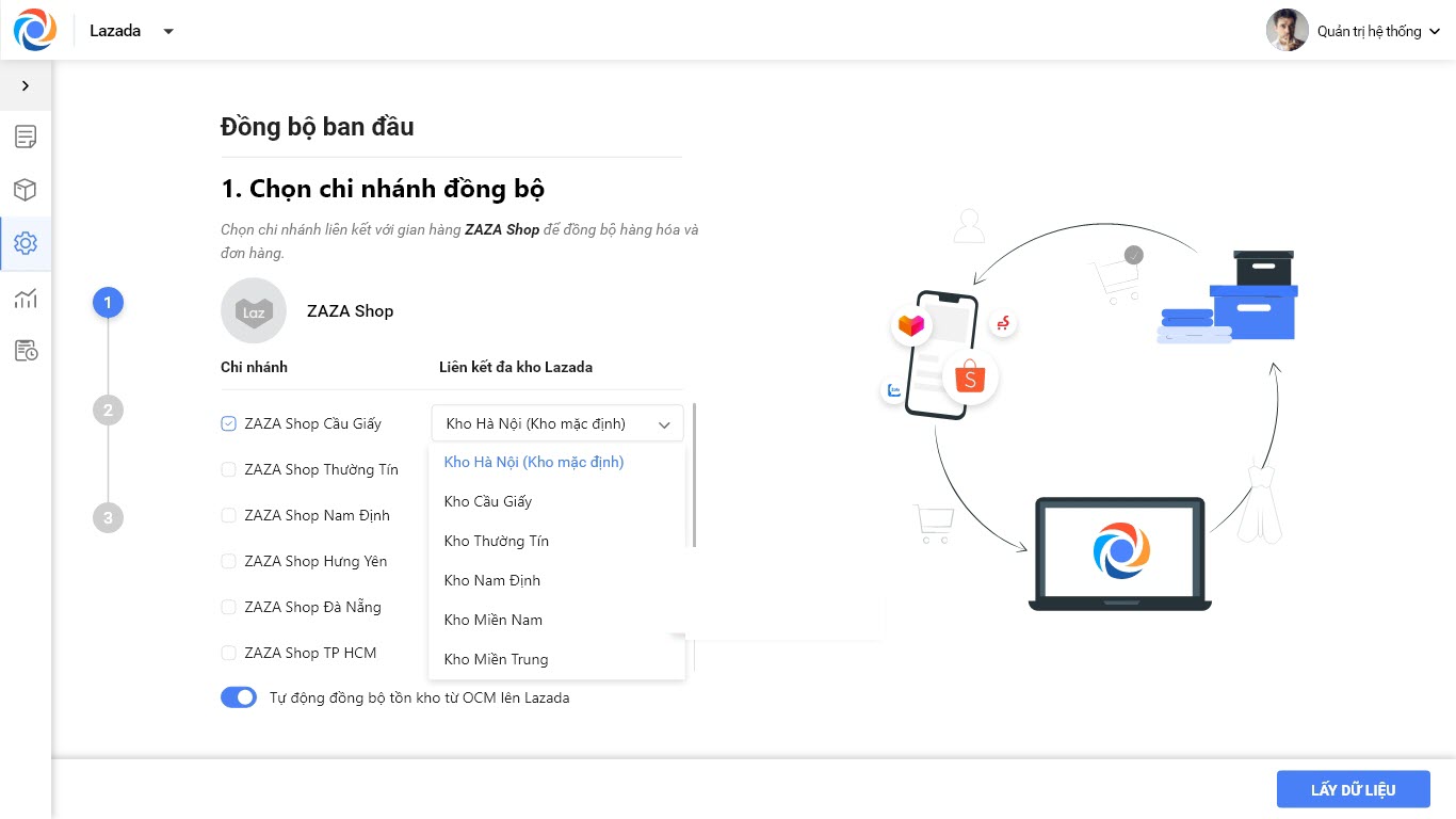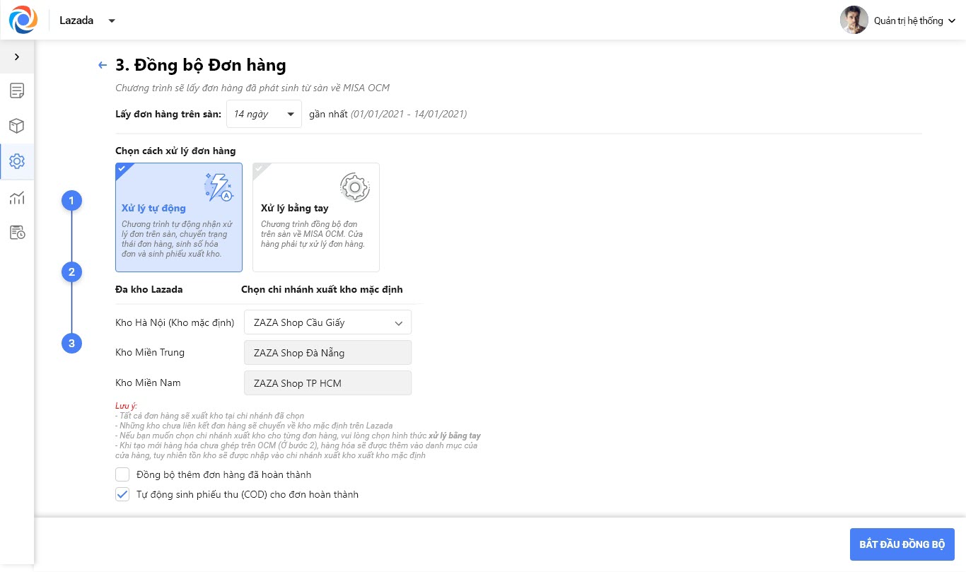 Bước 4: Đồng bộ đơn hàng từ Lazada về OCM, với mỗi kho trên Lazada cửa hàng cần chọn 1 chi nhánh xuất kho tương ứng để xử lý đơn hàng.