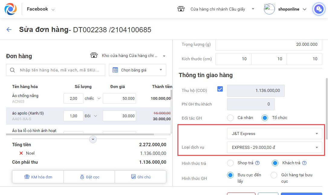 Bước 2: Khi tạo đơn giao hàng trên OCM, địa chỉ của đối tác giao hàng sẽ tự động được cập nhật theo thông tin đã thiết lập trên eShop.