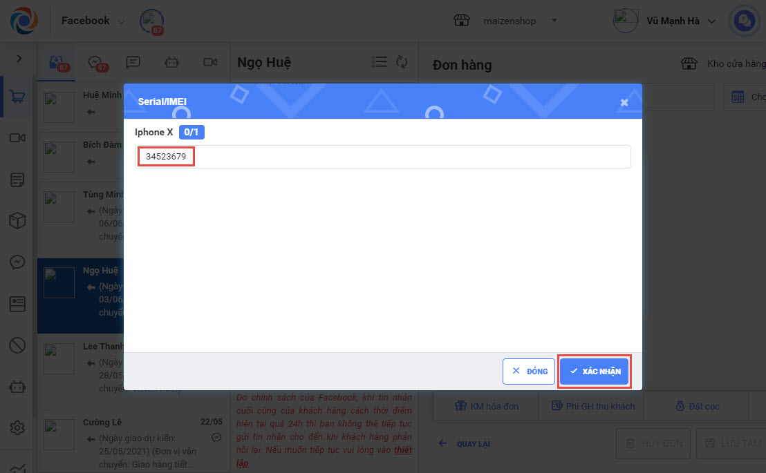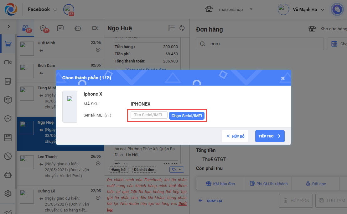 Khi tạo đơn hàng cho khách có chưa hàng hóa bán theo combo, khi thêm các hàng hóa trong combo, thu ngân có thể chọn Serial/IMEI cho các hàng hóa thuộc combo quản lý theo Serial/IMEI bằng cách chọn/nhập Serial/IMEI.