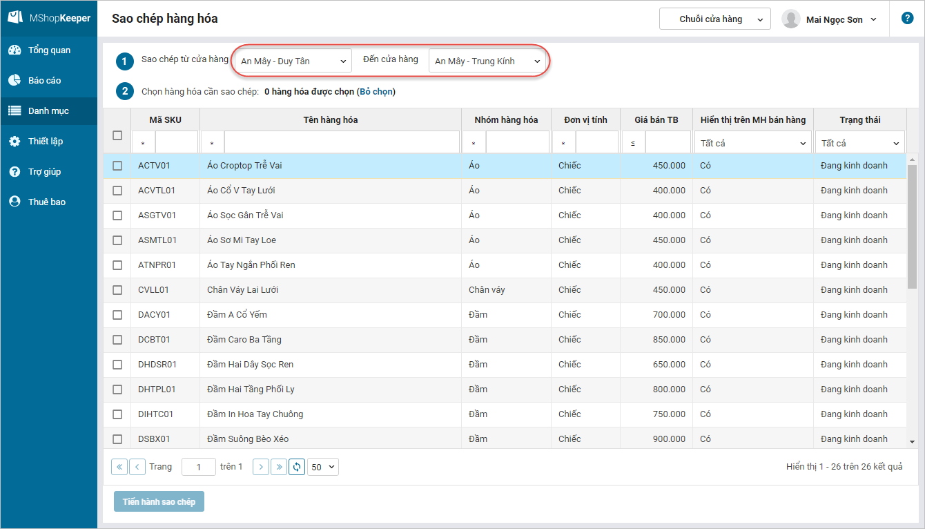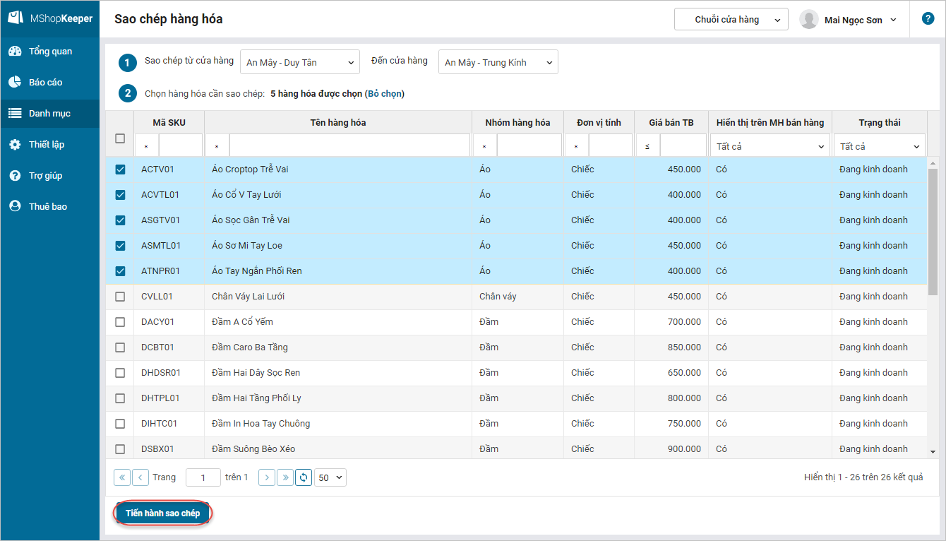 - Tích chọn các hàng hóa muốn sao chép, nhấn Tiến hành sao chép.