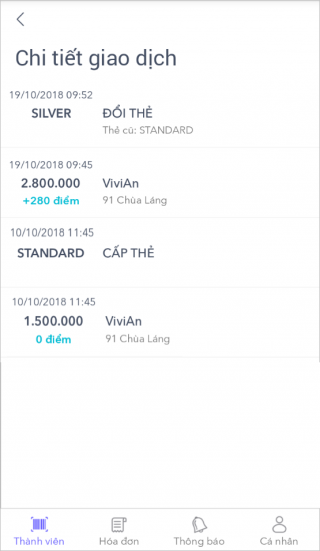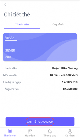 - Sau khi chọn thẻ thành viên, chương trình chuyển sang màn hình Chi tiết thẻ. Chọn Chi tiết giao dịch.