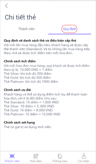 - Ngoài ra, nếu muốn xem chính sách cấp thẻ, xét hạng, chính sách tích điểm, đổi điểm của cửa hàng, chọn tab Quy định.