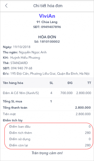 - Sau khi hoàn thành thanh toán, hóa đơn chi tiết sẽ được tự động gửi qua ứng dụng 5Shop cho khách hàng, có thể xem chi tiết số điểm trên hóa đơn.