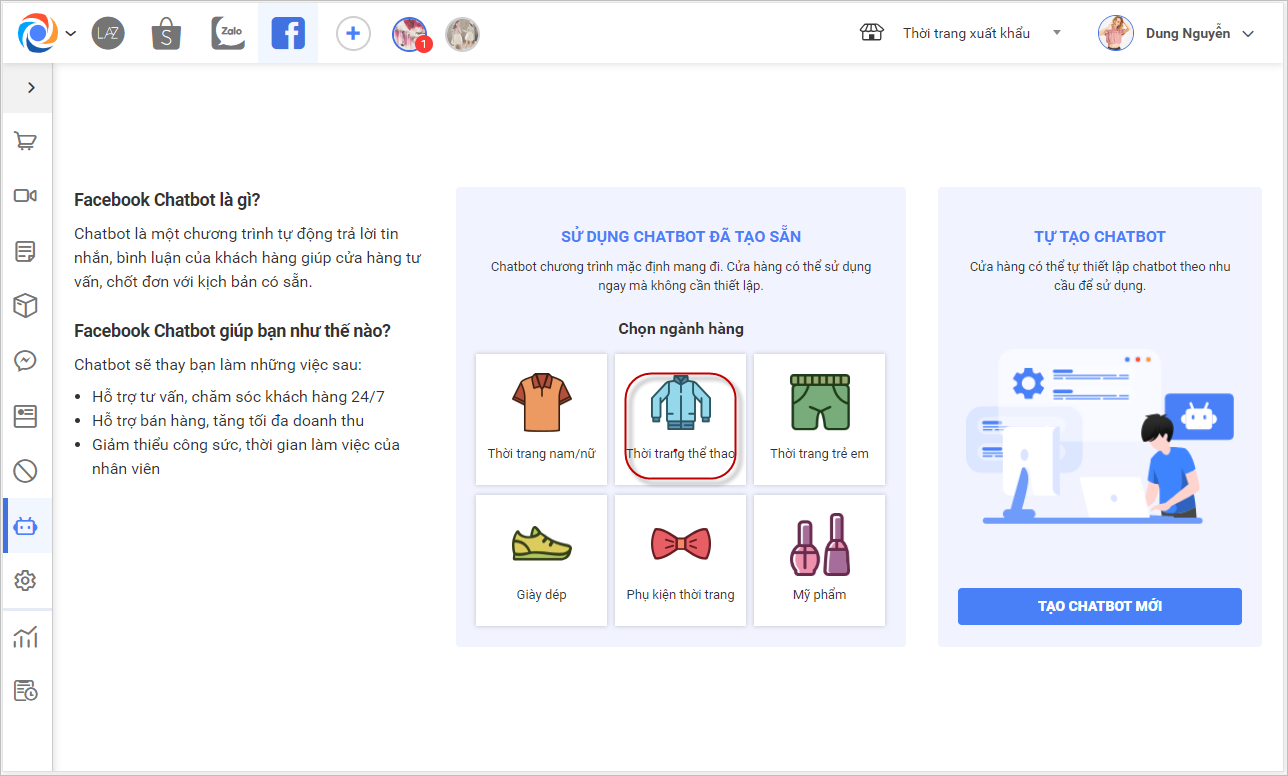 – Quản lý cửa hàng chọn 1 chatbot có sẵn có bằng cách click vào 1 ngành hàng trên chatbot giống với ngành hàng đang kinh doanh của cửa hàng (VD: Thời trang thể thao)
