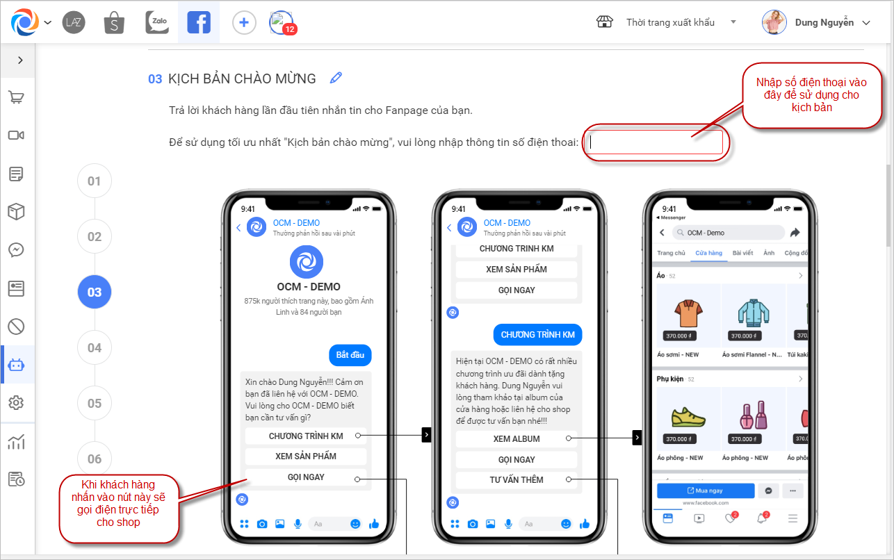 – Nhập số điện thoại của cửa hàng ở dòng thông tin Số điện thoại sử dụng cho Kịch bản chào mừng để khi khách hàng nhấn nút Gọi ngay trên tin nhắn sẽ gọi trực tiếp cho cửa hàng.