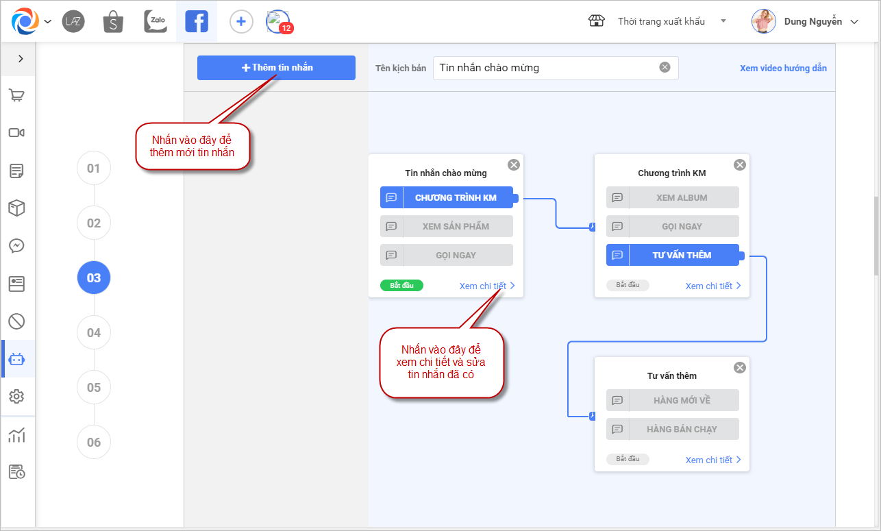 TH1: Với kịch bản chương trình đang mang đi 3 tin nhắn giống như màn hình kịch bản trước khi sửa, nhấn Thêm tin nhắn để thêm hoặc nhấn Xem chi tiết để sửa các tin nhắn đã có.