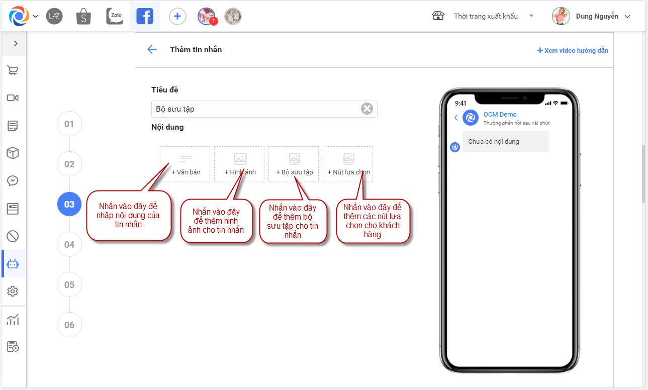 + Sửa Trả lời tin nhắn: Chương trình đang hiển thị nội dung tin nhắn tự động khách hàng sẽ nhận được khi nhắn tin đến page, nhập lại nội dung muốn thay đổi, các thao tác tương tự như thao tác thêm mới tin nhắn trong kịch bản ở phía trên